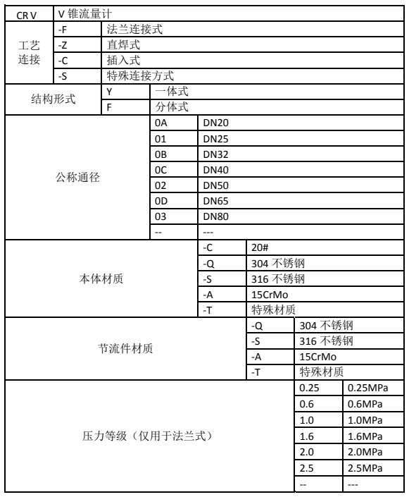 例:CR V-F Y 04 -C -Q 1.6 : V錐流量計(jì),一體式法蘭連接,公稱(chēng)通徑為DN100,本體材質(zhì)為20#,節(jié)流件材質(zhì)為304,壓力等級(jí) 1.6MPa。