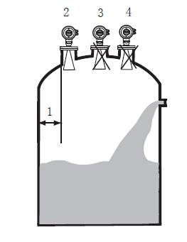 ● 建議距離(1)罐體內(nèi)壁至安裝短管的外壁應(yīng)大于罐直徑的1/6;● 離罐壁小距離為300mm;● 不能安裝在入料口的上方(4)?!?不能安裝在中心位置(3),如果安裝在中間,會產(chǎn)生多重虛假回波,干擾回波會導(dǎo)致信號丟失。● 如果不能保持儀表與罐壁的距離,罐壁上的介質(zhì)會黏附造成虛假回波,在調(diào)試儀表的時候應(yīng)該進行虛假回波存儲。 3.2 罐內(nèi)安裝