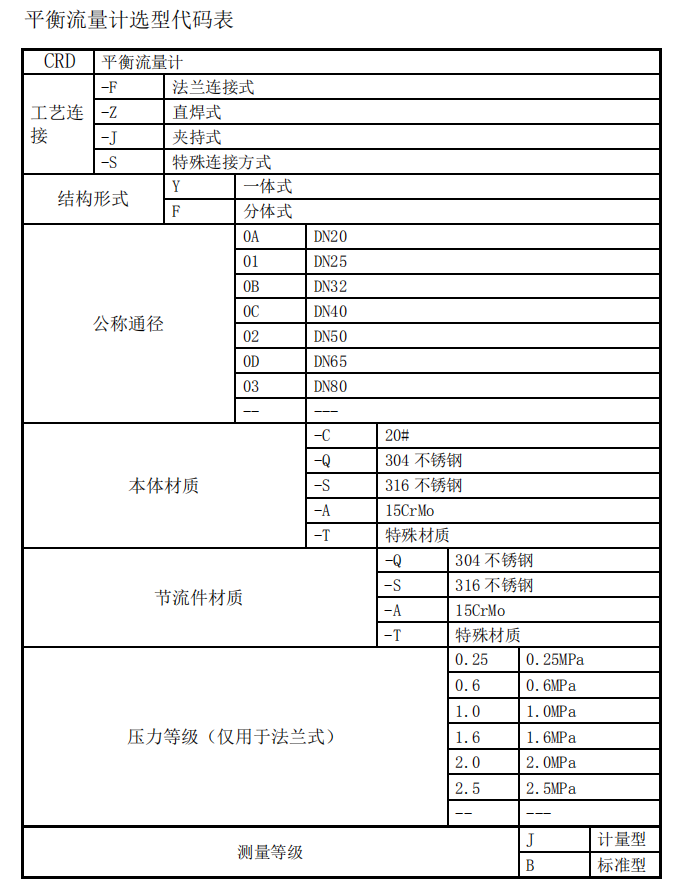 例:CRD -F Y 04-C -Q 1.6 J  平衡流量計(jì),一體式法蘭連接,公稱通徑為DN100,本體材質(zhì)為 20#,節(jié)流件材質(zhì)為304,壓力等級(jí) 1.6MPa,計(jì)量型。更多產(chǎn)品內(nèi)容詳情請(qǐng)電話咨詢。