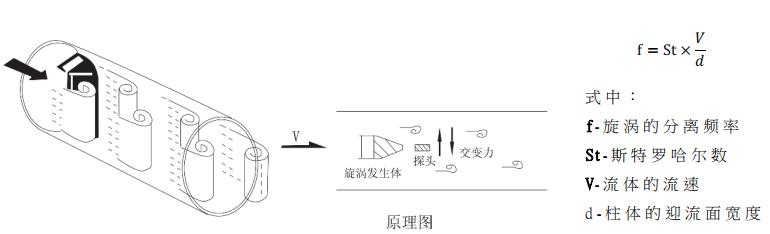 當(dāng)流體以流速流經(jīng)設(shè)置在流場(chǎng)中的旋渦發(fā)生體時(shí),在柱體的下游產(chǎn)生一對(duì)交替出現(xiàn)的而且排列整齊的渦列 (渦街),先在柱體的一側(cè)產(chǎn)生,繼而在柱體的另一側(cè)產(chǎn)生。這一產(chǎn)生旋渦的理論首先由卡門(mén)(Kaxman) 提出,命名 為卡門(mén)渦街,并給出了頻率與流速的關(guān)系式,其中系數(shù)被命名為斯特羅哈爾數(shù)(圖 1)。