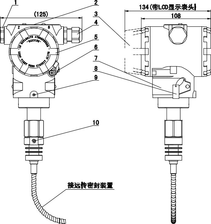 1. 電氣密封悶頭 2. 就地按鈕(蓋板下) 3. 電子部件側(cè)表蓋 4.電氣接口:M20×1.5 電纜密封頭 5. 接線端表蓋 6. 表蓋安全固定扣(防爆) 7. 銘牌 8. 懸掛式位號(hào)牌(選件) 9. 電子外殼旋轉(zhuǎn)定位鏍釘 10. 遠(yuǎn)傳充灌密封口 |