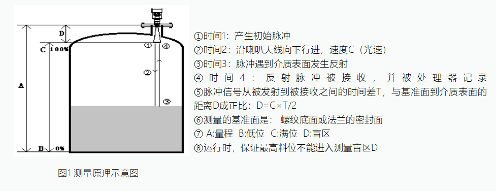 CRRD500 雷達(dá)物位計(jì)通過天線發(fā)射極窄且能量很低的微波脈沖信號,這個(gè)脈沖信號以光速在空間傳輸,遇到被測介質(zhì)發(fā)生反射,反射信號被儀表接收,發(fā)射脈沖信號與接收脈沖信號的時(shí)間間隔與基準(zhǔn)面到被測介質(zhì)表面的距離成正比,通過測量發(fā)射與接收的時(shí)間間隔,來實(shí)現(xiàn)天線至介質(zhì)表面距離的測量。