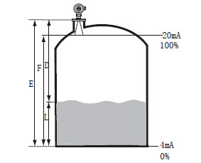 通過輸入空罐高度E(=零點),滿罐高度F(=滿量程)及一些應(yīng)用參數(shù)來設(shè)定,應(yīng)用參