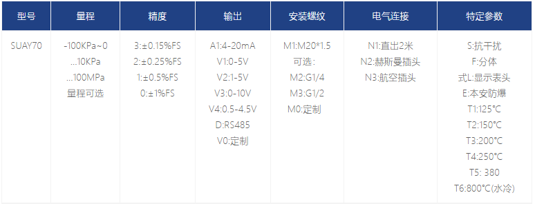 SUAY70 高溫壓力變送器采用耐高溫的硅-藍(lán)寶石技術(shù)的感壓膜片作為核心,匹配特殊的溫度補償和片上線性修正技術(shù),使其在寬泛的溫區(qū)內(nèi)有著良好 的綜合性能。藍(lán)寶石材料對溫度變化極不敏感,可在-40 至380℃的高溫下,也有著ji佳的彈性力敏特性,不會產(chǎn)生疲勞、滯后、PN 節(jié)漂移等現(xiàn)象,并且抗輻射性能優(yōu)異。耐磨損,抗疲勞的鈦合金感壓膜片,使該系列產(chǎn)品不僅可以承受高溫,更兼具良好的耐用性、抗沖擊性。利用β相高溫力敏材料與合理的結(jié)構(gòu)設(shè)計,可將溫度擴展至 450-850℃。