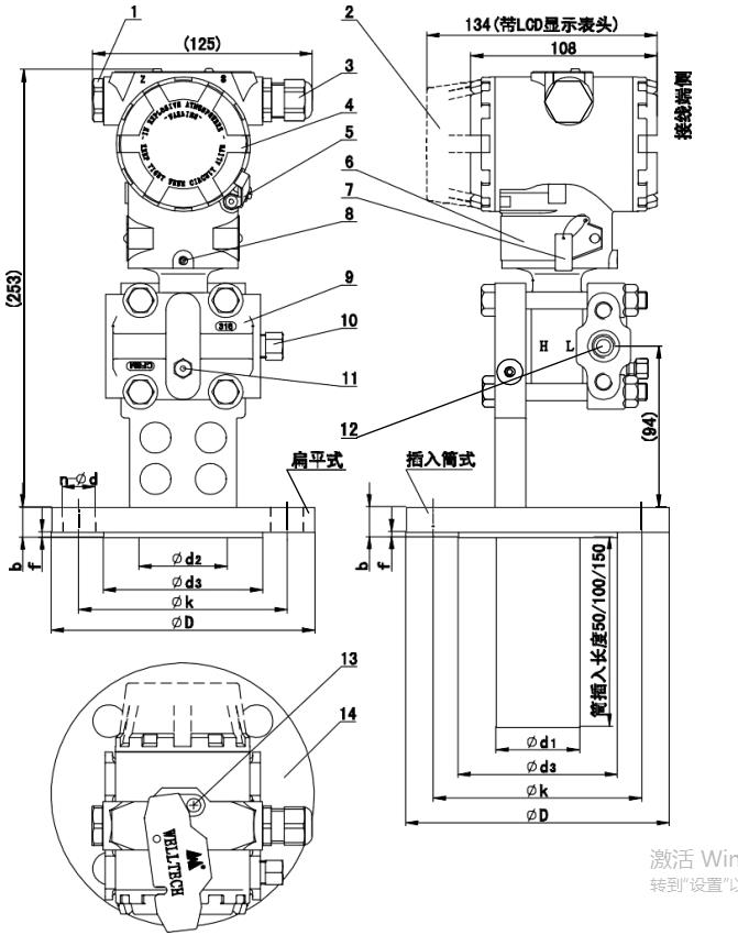 1.電氣密封悶頭 2.電子部件側(cè)表蓋 2. 電氣接口:M20×1.5 電纜密封頭 4.接線端表蓋 5.表蓋安全固定扣(防爆) 6.銘牌 7.懸掛式位號(hào)牌(選件) 8.電子外殼旋轉(zhuǎn)定位螺釘 9.低壓側(cè)過程法蘭 10.低壓側(cè)過程連接悶頭或泄放閥(選件) 11.低壓側(cè)側(cè)面泄放螺釘(選件) 12.低壓側(cè)過程連接:NPT1/4 內(nèi)螺紋, 法蘭接口符合DIN19213 13.就地按鈕 14.液位法蘭 |