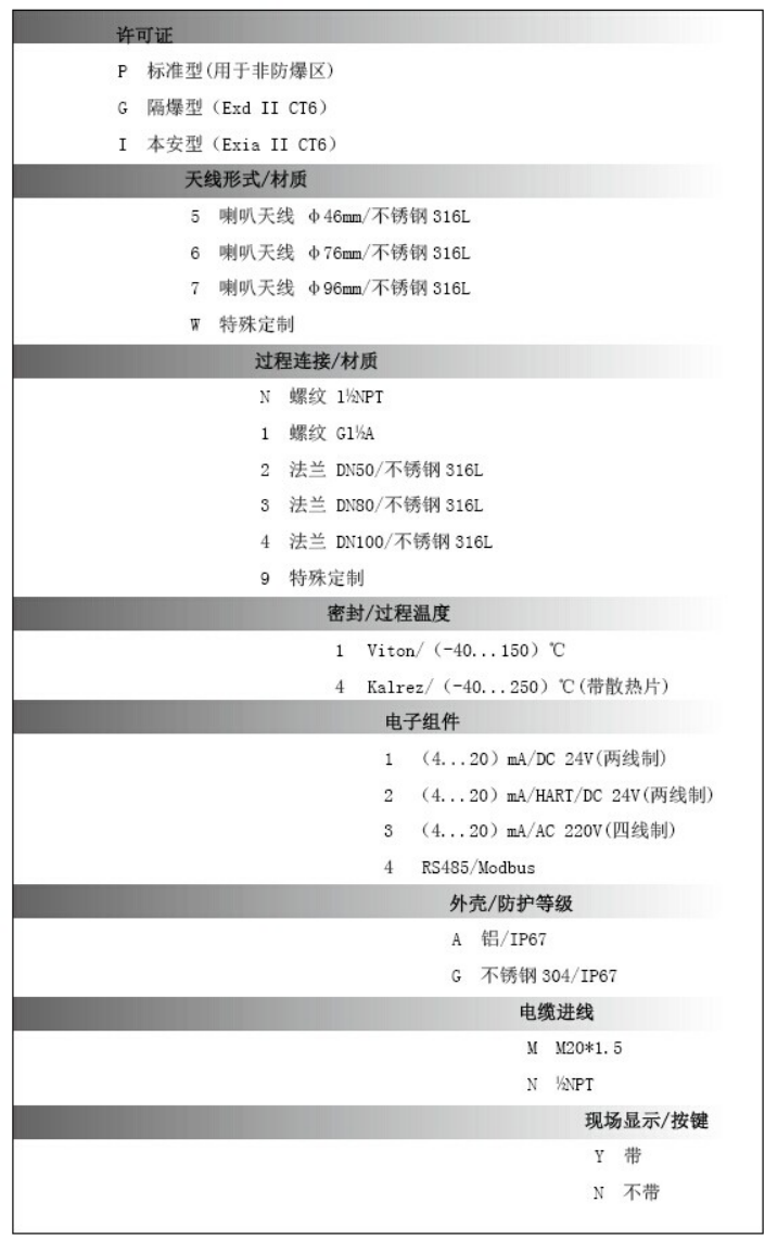 ①時間1:產(chǎn)生初始脈沖②時間2:沿喇叭天線向下行進,速度C(光速)③時間3:脈沖遇到介質(zhì)表面發(fā)生反射④時間4:反射脈沖被接收,并被處理器記錄⑤脈沖信號從被發(fā)射到被接收之間的時間差T,與基準面到介質(zhì)表面的距離D成正比:D=C×T/2⑥測量的基準面是: 螺紋底面或法蘭的密封面⑦ A:量程 B:低位 C:滿位 D:盲區(qū)⑧運行時,可達到Z高料位不能進入測量盲區(qū)D 技術(shù)優(yōu)勢:? 采用高達26GHz的發(fā)射頻率? 波束角小,能量集中,具有抵干擾能力,增加了測量精度與可靠性? 測量盲區(qū)小,對于小罐測量也會取得作用? 波長短,對于小顆粒介質(zhì)與傾斜的介質(zhì)表面的物位測量效果好? 測量靈敏、刷新速度快、天線尺寸小、安裝簡便、免維護? 非接觸式測量,無磨損,可測量液體,固體介質(zhì)的物位? 幾乎不受溫度、壓力、水蒸汽、泡沫、粉塵等復雜工況的影響? 采用兩線制回路供電的功能,供電電壓和輸出信號通過一根兩芯電纜傳輸,節(jié)省成本? 采用微處理器和回波處理可適用于復雜工況? 發(fā)射功率J低,可安裝于金屬、非金屬容器內(nèi),對人體環(huán)境均無傷害? 帶有按鍵的顯示屏可方便設置儀表的參數(shù)可應用的行業(yè):化工與石化、電力、 鋼鐵及冶金、 礦產(chǎn)、造紙及紙漿、水及污水、食品與飲料、 制藥 ??蓱玫墓r:中間料倉、儲倉、料斗、儲罐、過程罐、攪拌罐、其他。主要參數(shù):應 用: 耐溫、耐壓、輕微腐蝕的液體頻率范圍: 26GHz測量范圍: 0-30m精 度: ±3mm介質(zhì)溫度: -40...250℃過程壓力: -0.1...4.0Mpa過程連接: 螺紋、法蘭防爆等J: Exia II CT6;Exd II CT6防護等J: IP67信號輸出: 4...20mA/HART(兩線/四線)RS485/Modbus